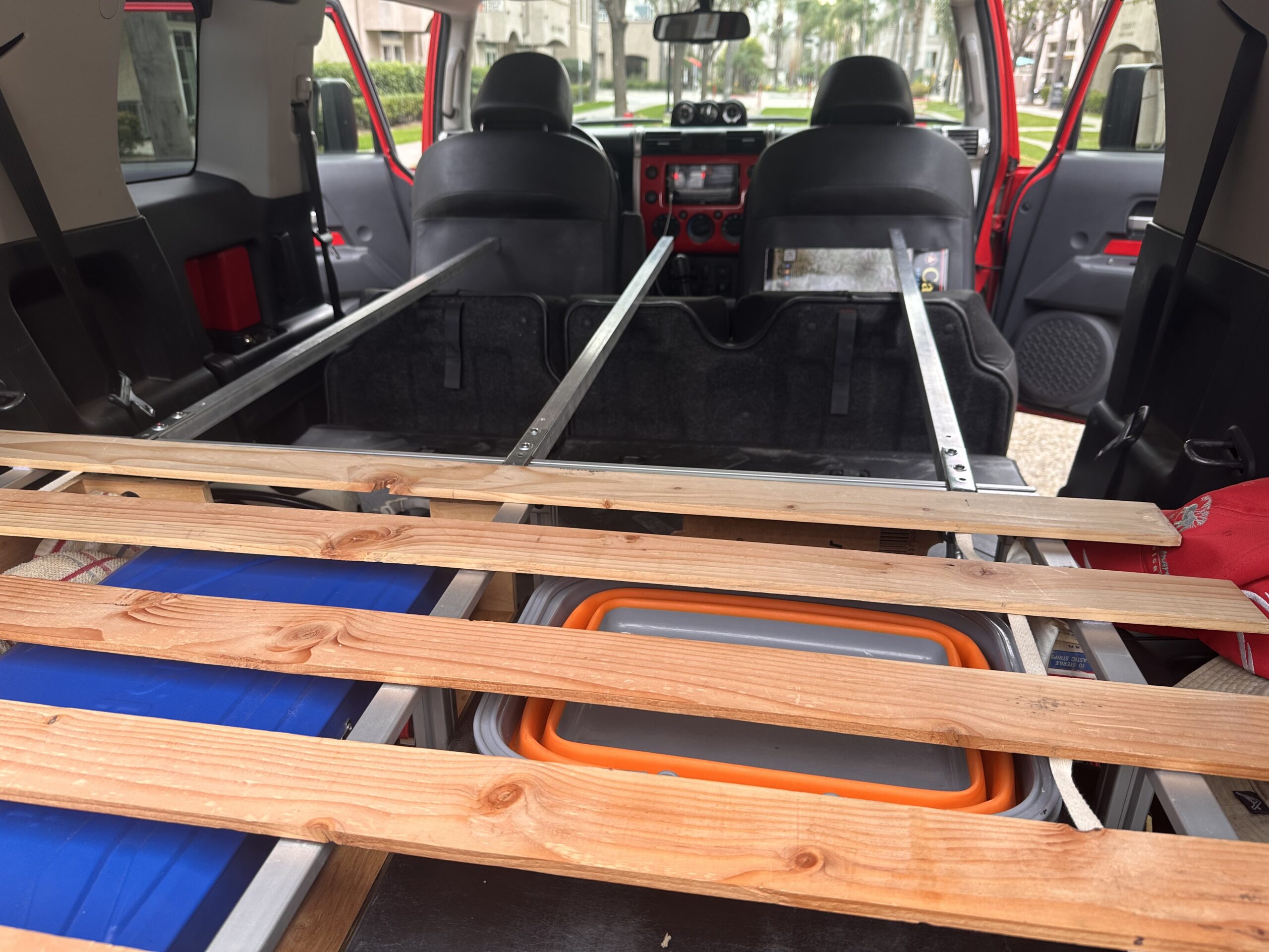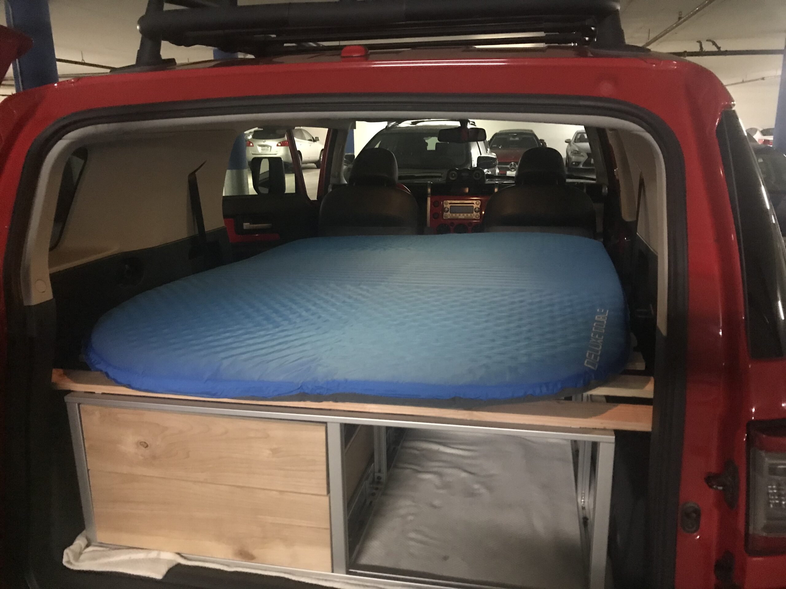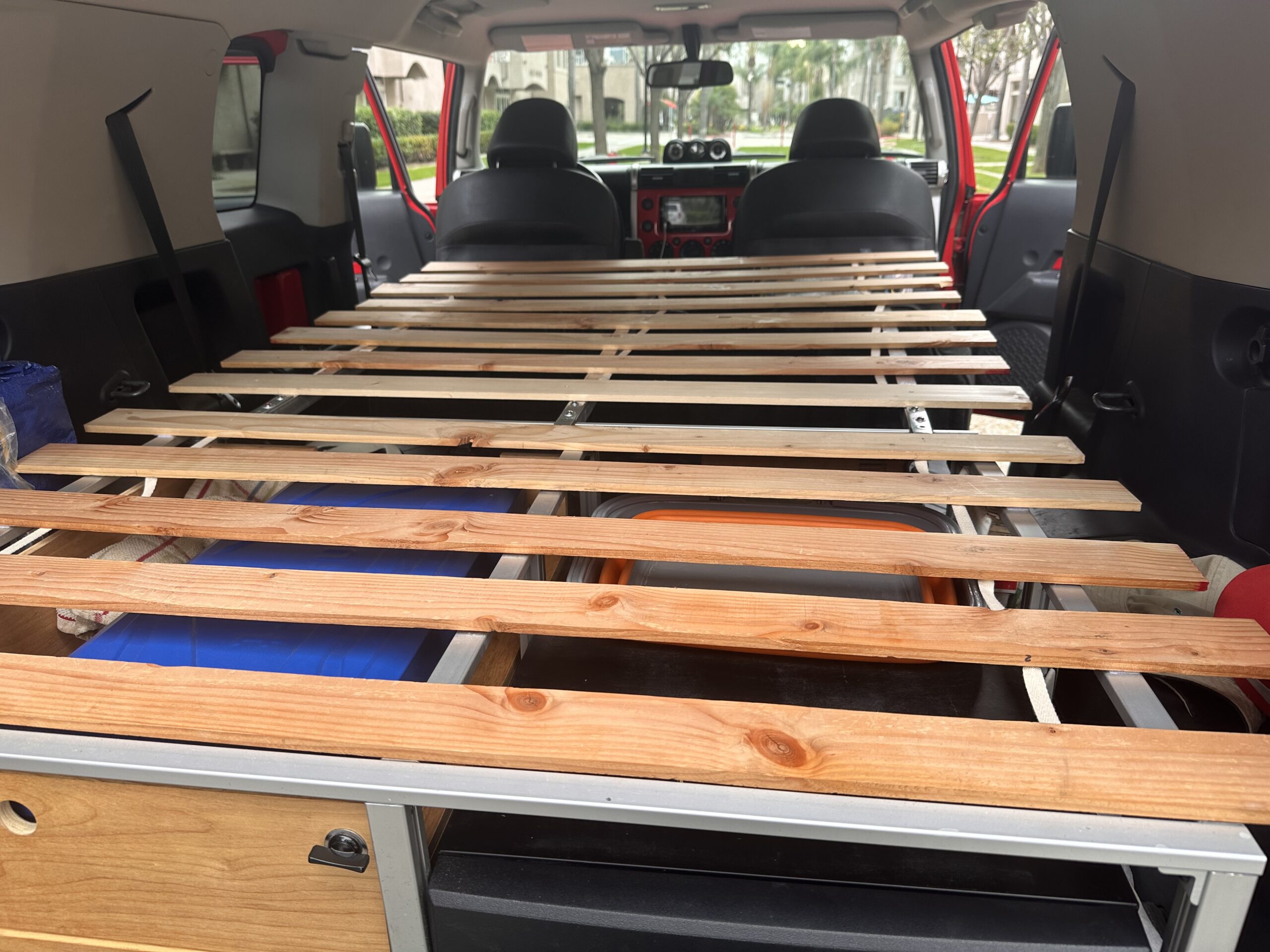 The sleeping platform extends from the trunk area to the front of the vehicle via 3 aluminum support bars, on top of which go the bed platform wood slats and an inflatable mattress. The bars and the bed slats are removable and go in a dedicated carrying bag. Because the trunk in the FJ cannot be opened from the inside, I installed a manual mechanism so it can now be opened from the sleeping area.
