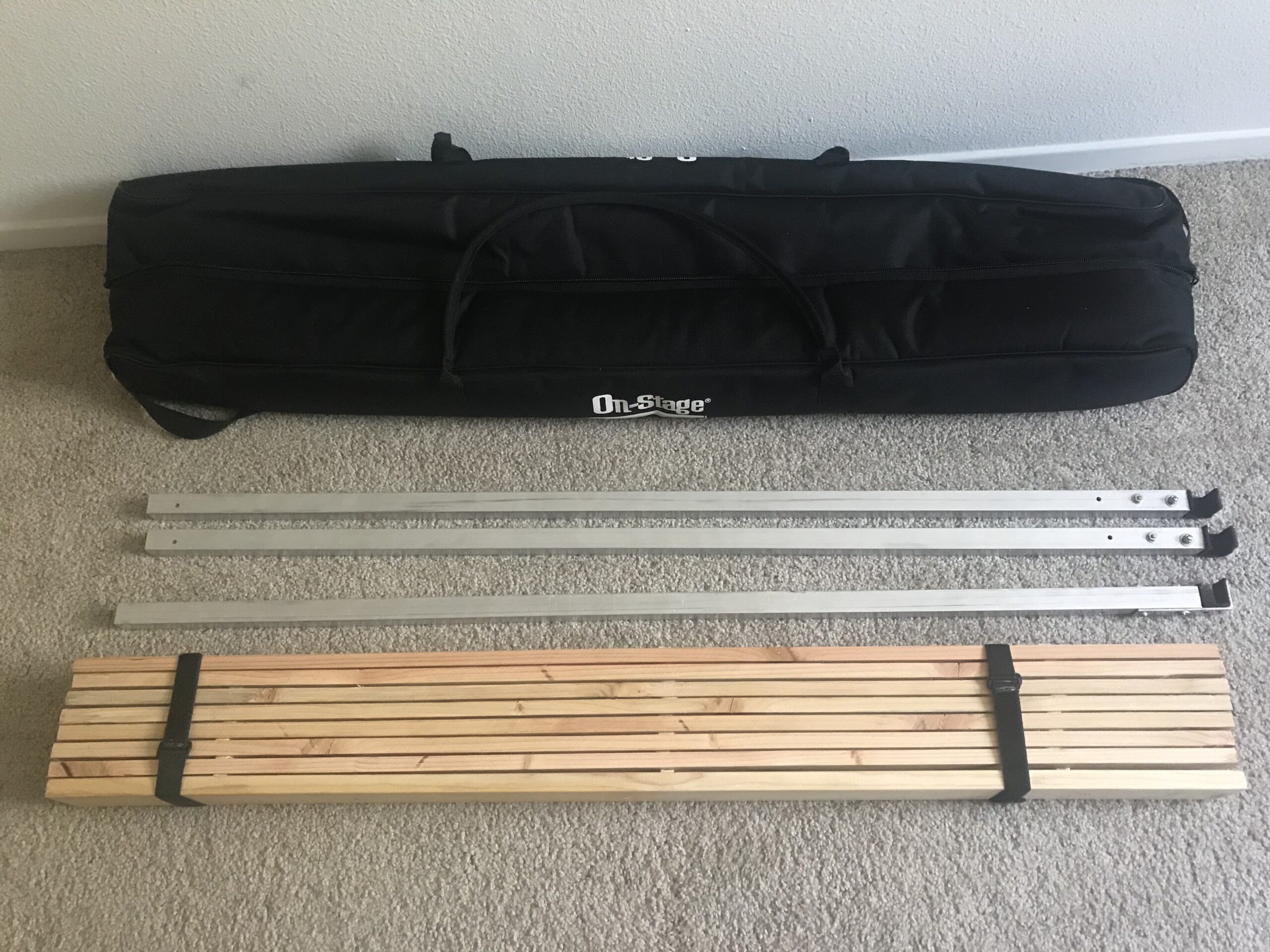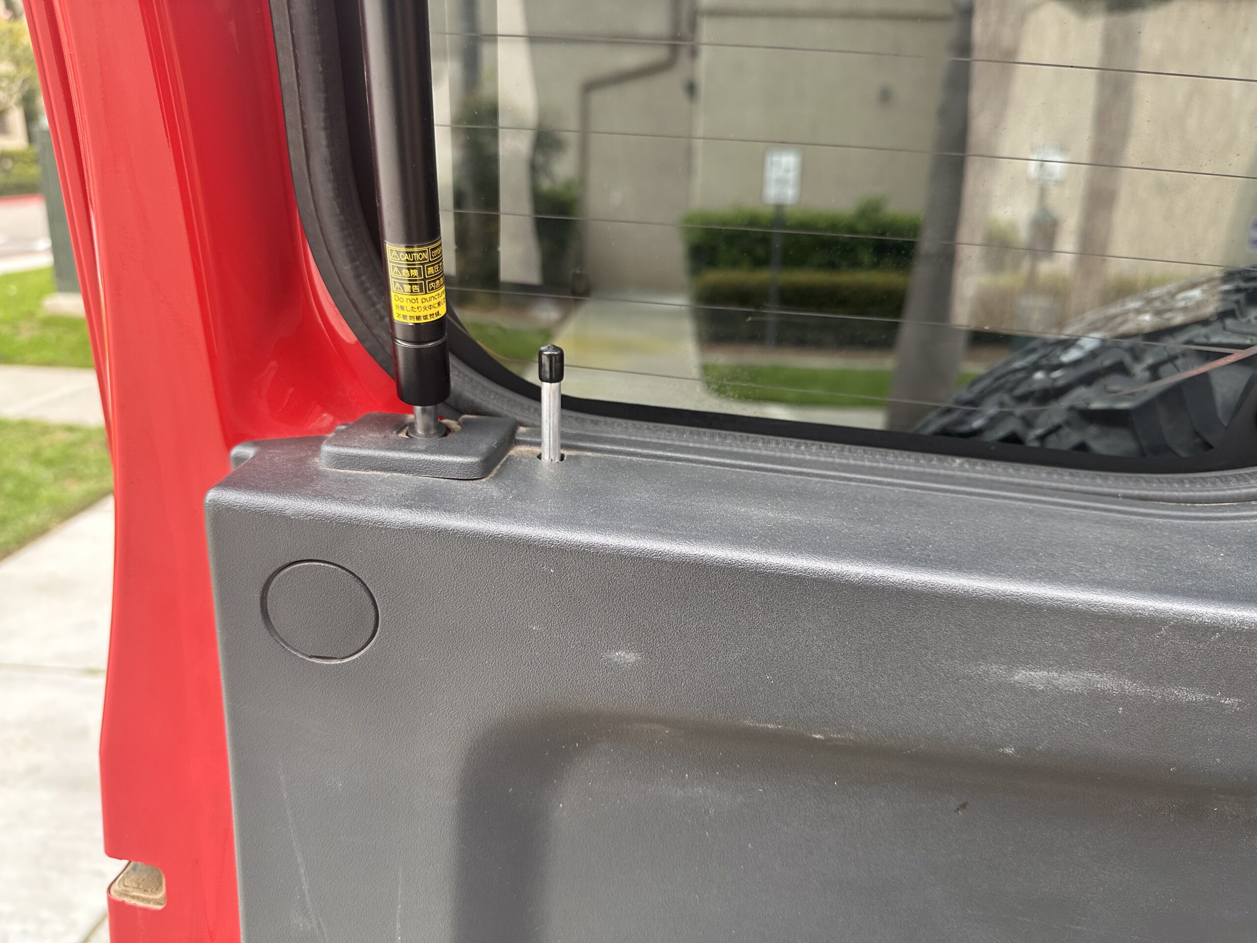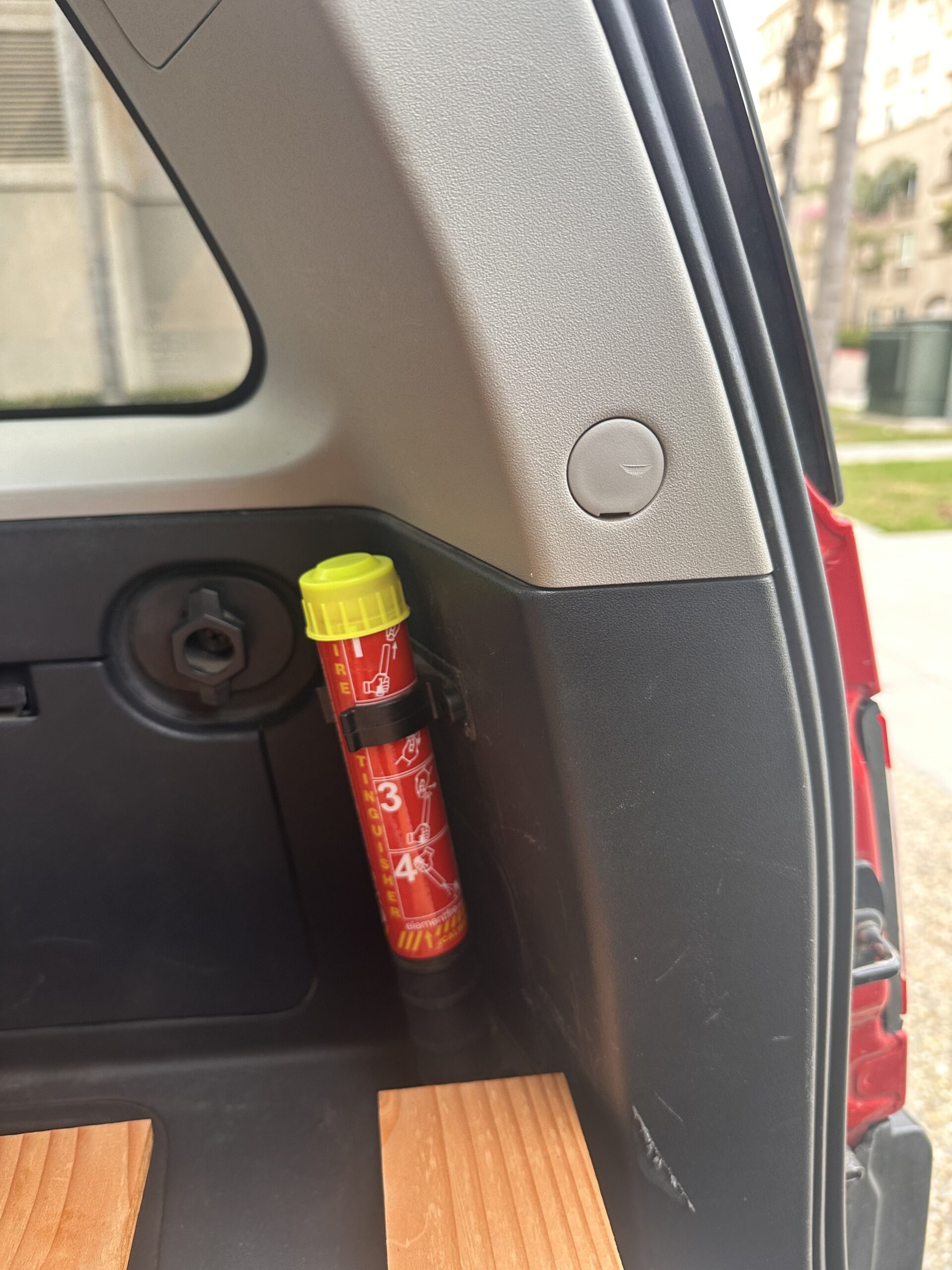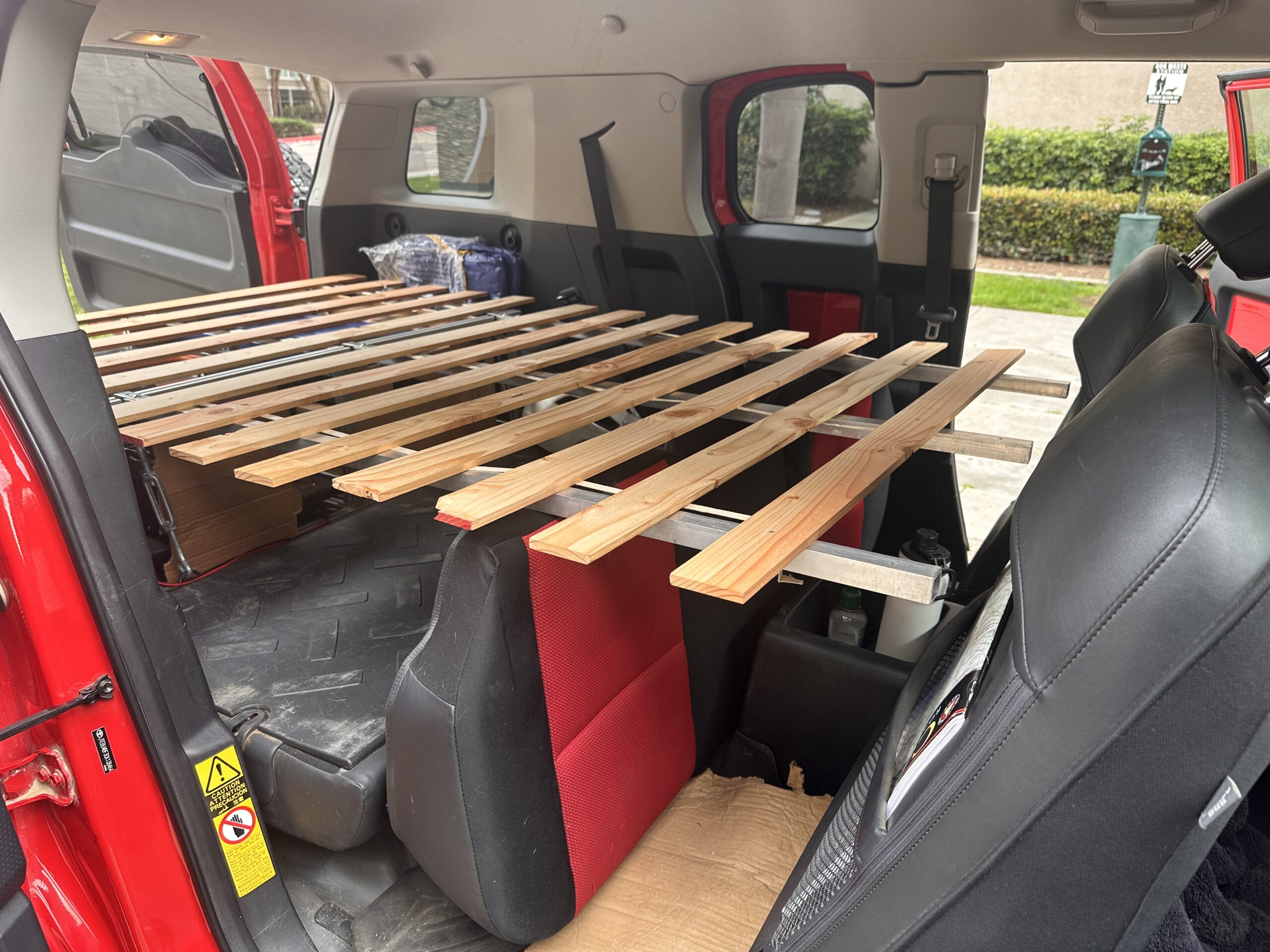 The sleeping platform extends from the trunk area to the front of the vehicle via 3 aluminum support bars, on top of which go the bed platform wood slats and an inflatable mattress. The bars and the bed slats are removable and go in a dedicated carrying bag. Because the trunk in the FJ cannot be opened from the inside, I installed a manual mechanism so it can now be opened from the sleeping area.
