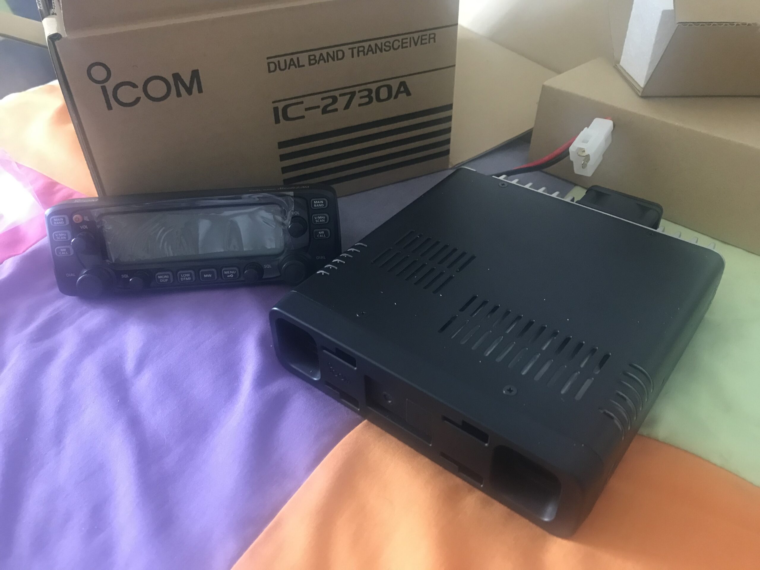 Professionally installed ICOM IC-2730A, including the suction cup base, mounting bracket (still new and unused in box, as it turned out to be unnecessary for under dash mounting) and remote head mounting bracket.