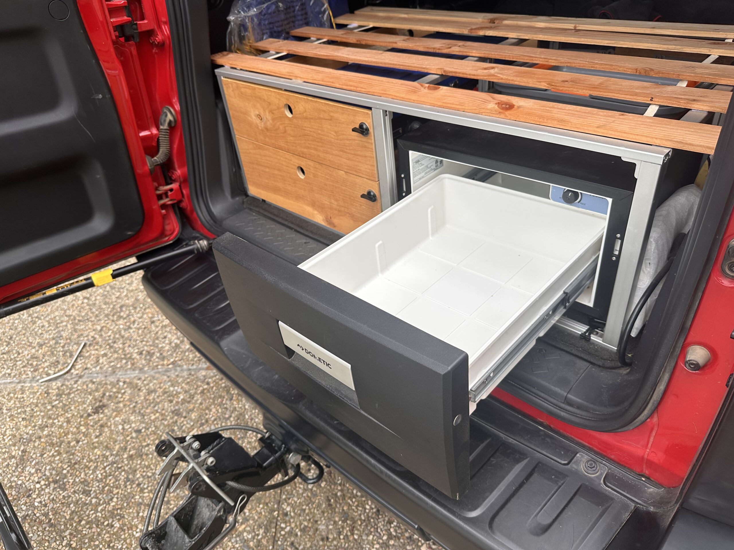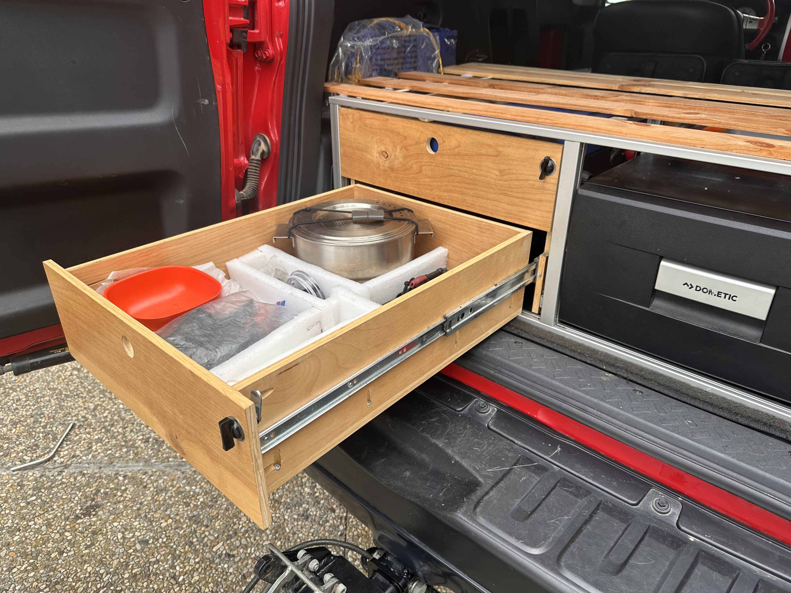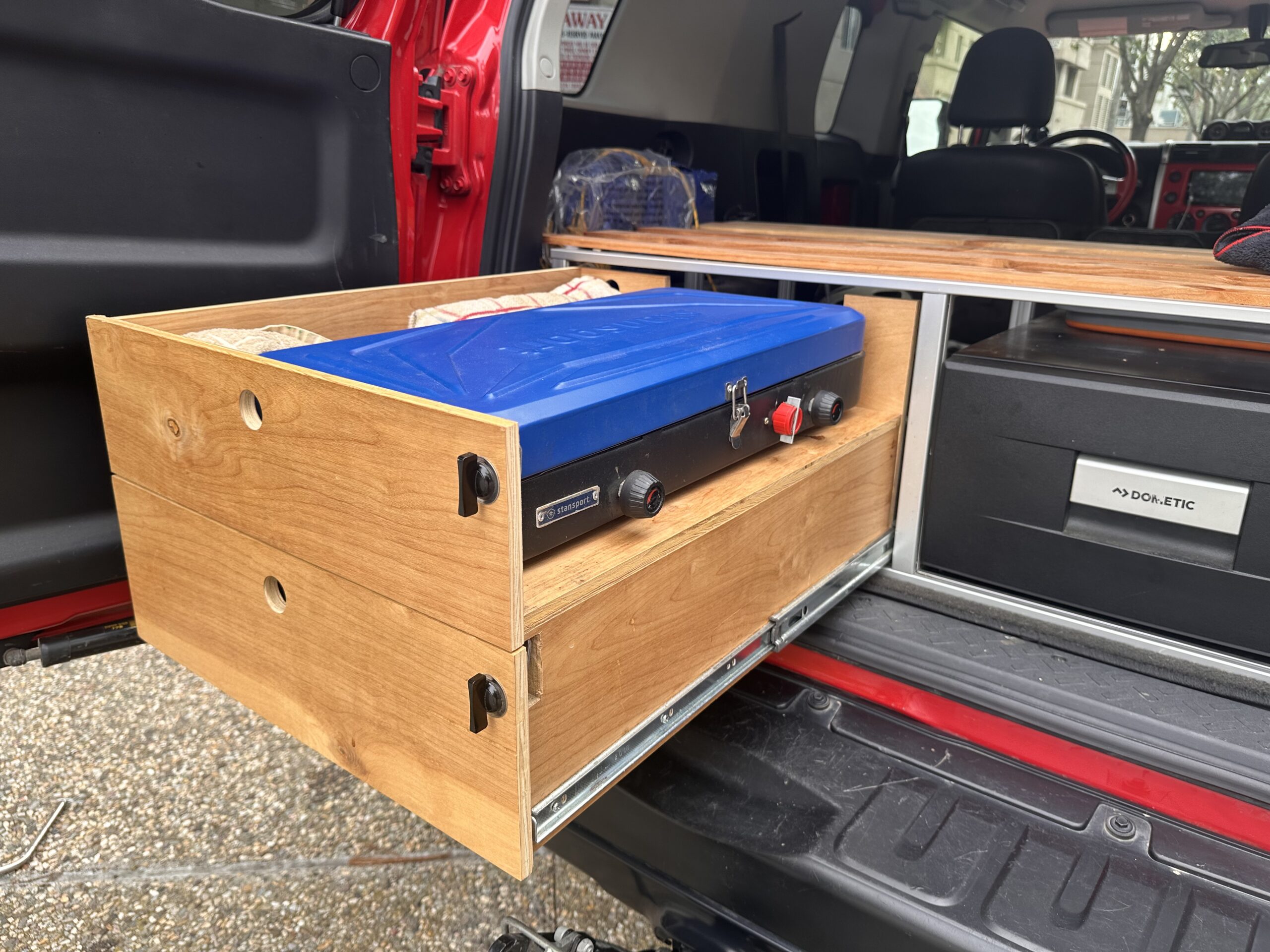 Custom galley, sleeping platform system made from sturdy but lightweight aluminum. Two drawer system extend independently; one is the stove platform, the other holds cooking gear. 12V Dometic CD-30 drawer fridge.