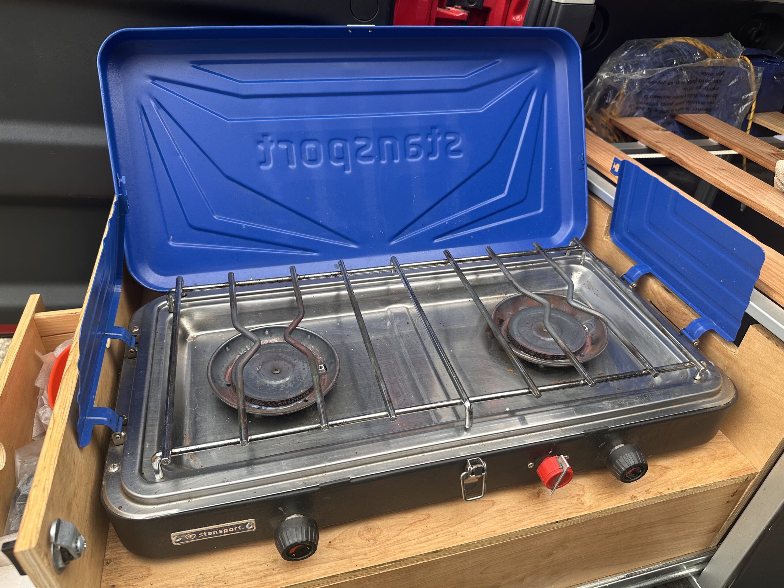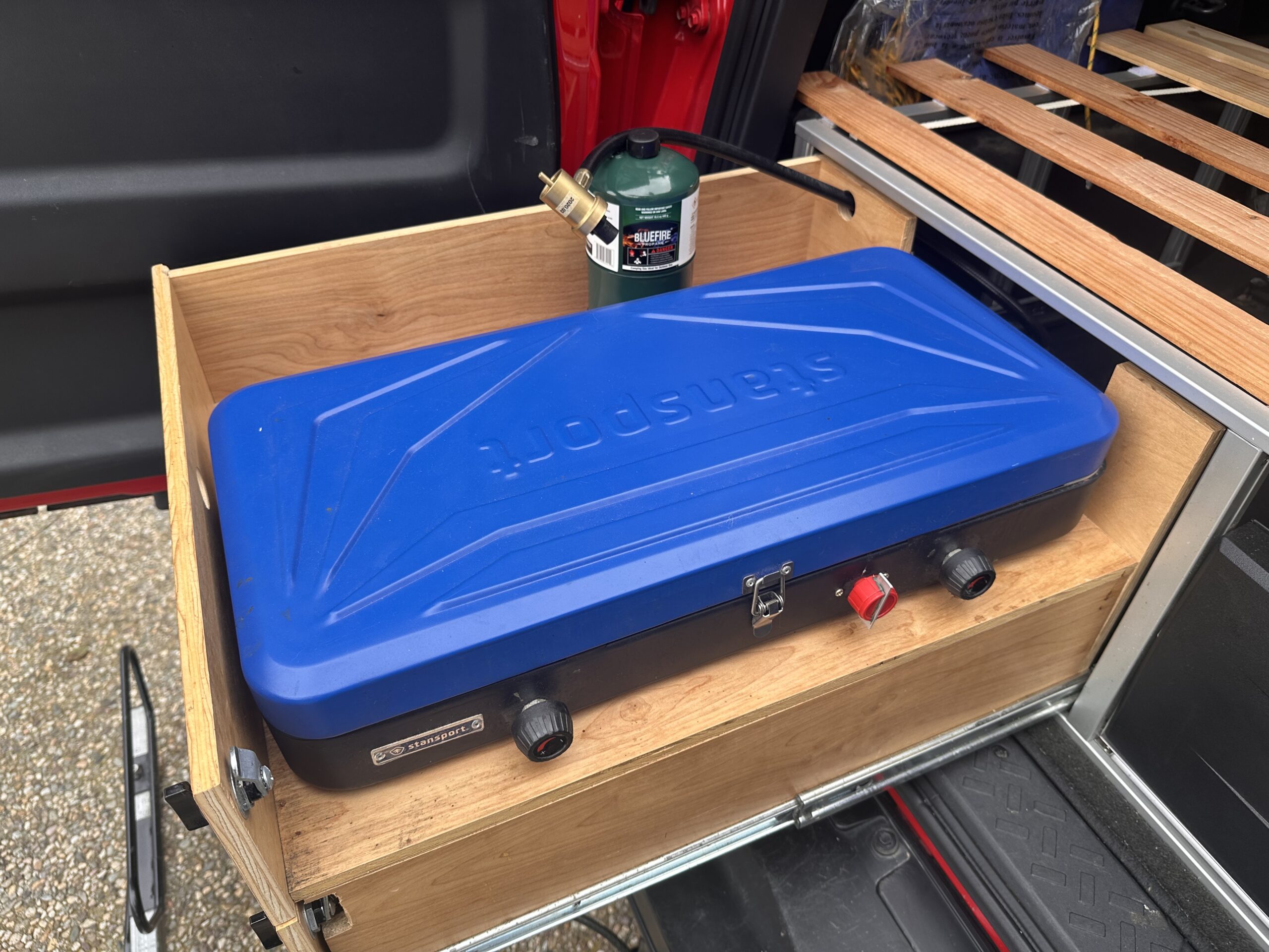 - Integrated galley system (two drawers + two-burner stove) that extends into a comfy sleeping platform for two